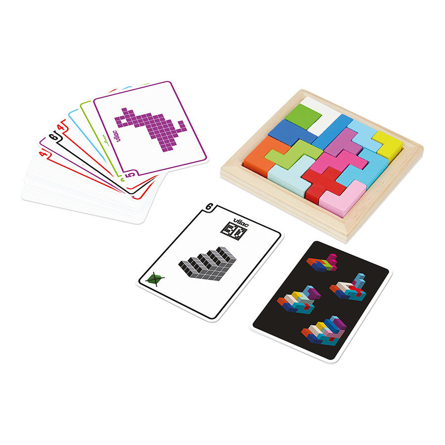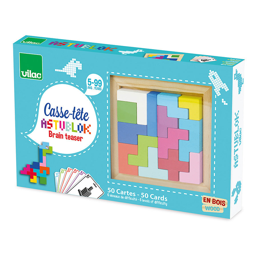 Astubloc - coffret casse-tête avec des formes géométriques en bois. Livré avec 50 cartes de modèles et de niveaux différents pour résoudre des casse-tête en 2D mais également en 3D ! A partir de 5 ans.