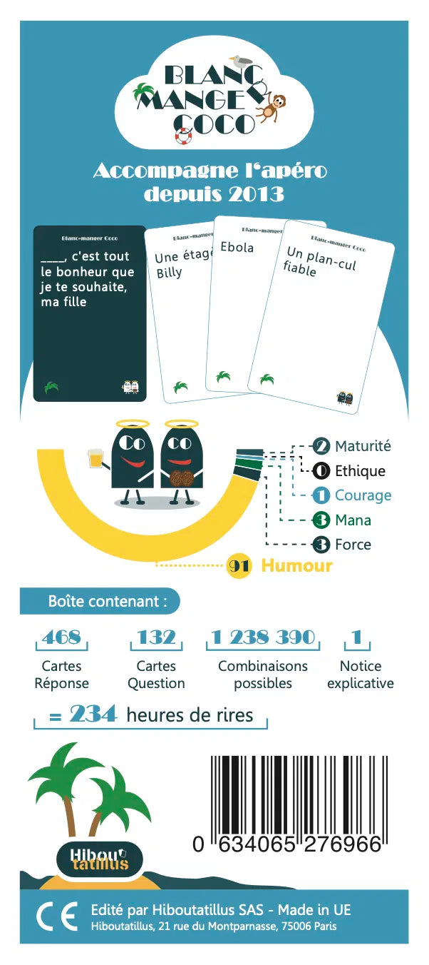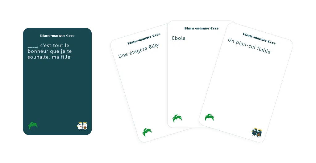 Oubliez vos valeurs morales, mettez de côté la bienséance, et asseyait vous bien confortablement sur votre pudicité. Blanc Manger Coco c’est l'irrévérence et le politiquement incorrect dans une boîte. Pour l’emporter il vous faudra être le plus drôle possible en complétant la phrase à trou énoncée par le maître du jeu avec l’une de vos 11 cartes réponses dont vous disposez en mains.