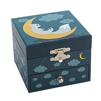 Lorsqu’il est chargé de lumière, ce coffret musical brille dans la nuit. Une petite lumière rassurante dans le secret de la chambre qui s'endort.