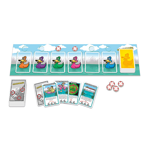 D’innocents canards barbotent en file indienne, mais personne n’est en sécurité dans ces eaux mitraillées... À chaque tour, vous devez simplement jouer l’une de vos 3 cartes. Les joueurs vont ainsi pouvoir viser, tirer, affecter la disposition des canards en se cachant derrière son voisin, etc. Mettez vos protégés à l’abris et canardez les volatiles adversaires car le dernier survivant sera le gagnant !