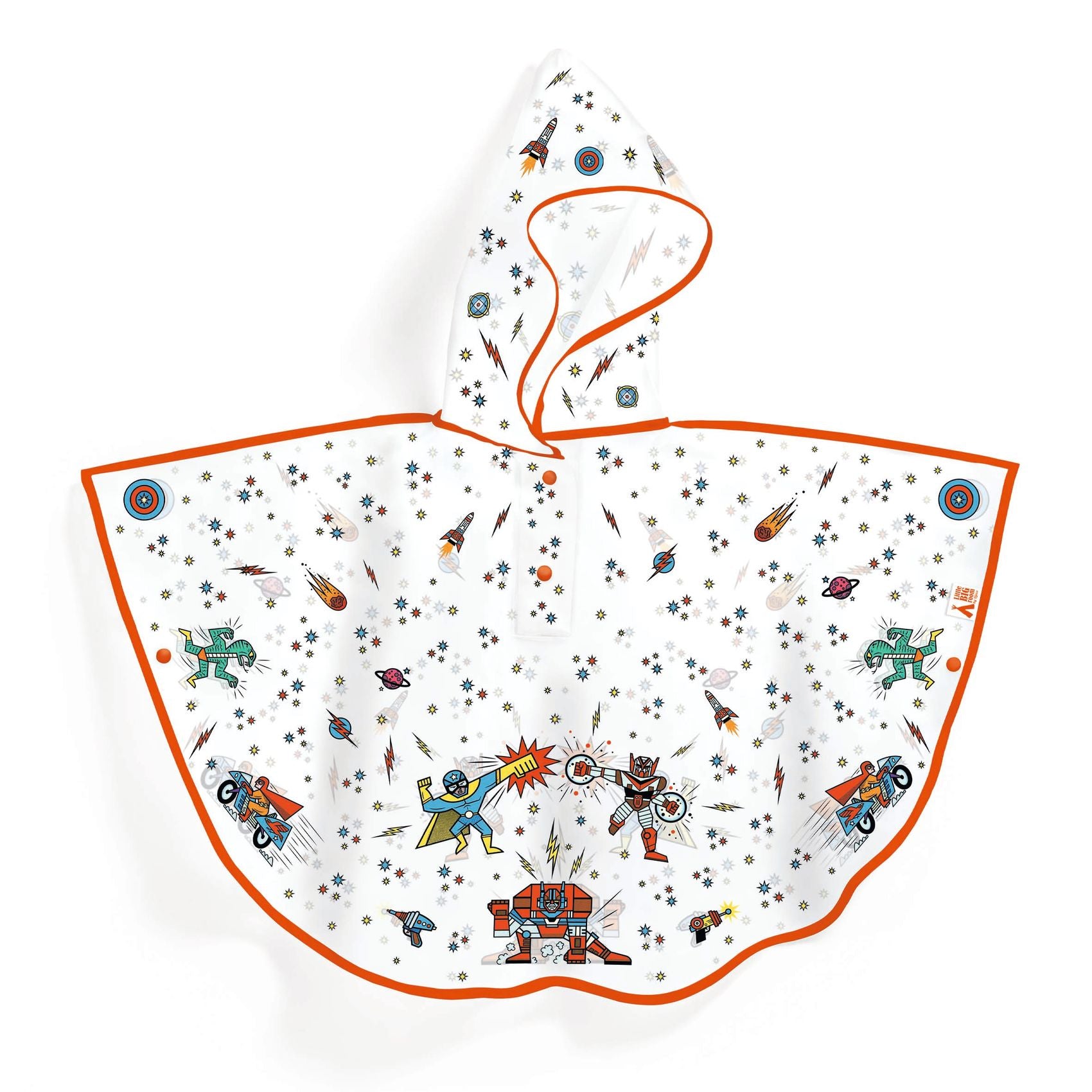 Même pas peur de la pluie super-héros ! Une cape de pluie avec capuche (5 -7 ans), chic et pratique. Douce et souple, elle est agréable à porter et accompagne l'enfant dans ses mouvements. Elle s'enfile facilement grâce à ses boutons pression. Un accessoire idéal pour égayer les sorties sous le pluie !