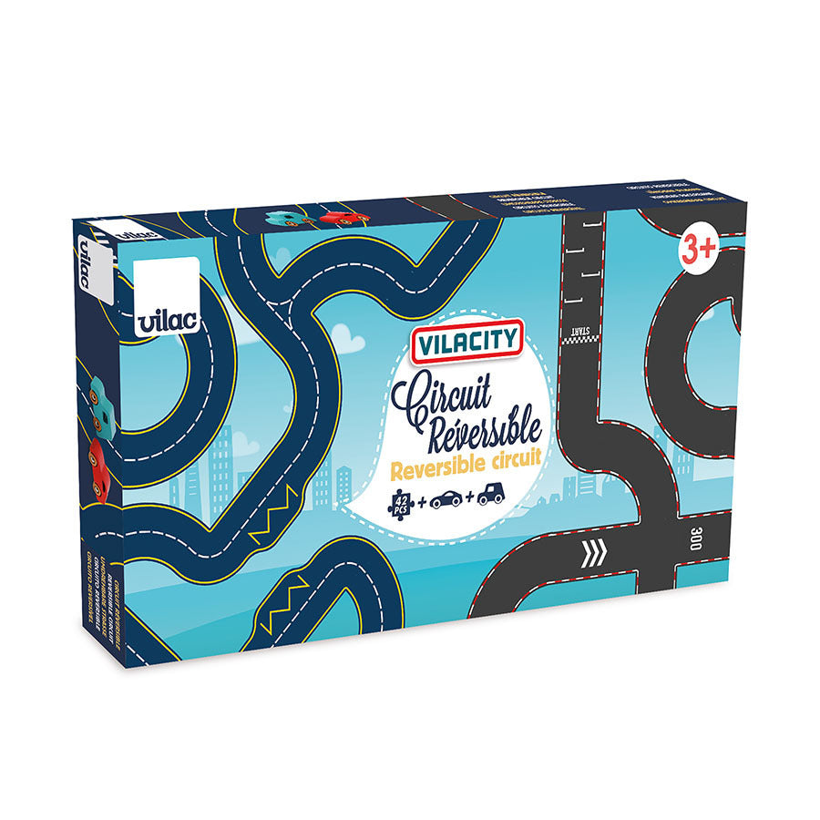 Vilacity, un magnifique support pour stimuler l’imagination de votre enfant. Une face circuit de course, une face route, ce qui permettra de multiples associations possibles. Livré avec 2 voitures en bois, ce circuit en carton est compatible avec la majorité des petites voitures en bois ou en métal. Le carton utilisé, résistant et léger, va permettre un montage et un démontage réguliers.