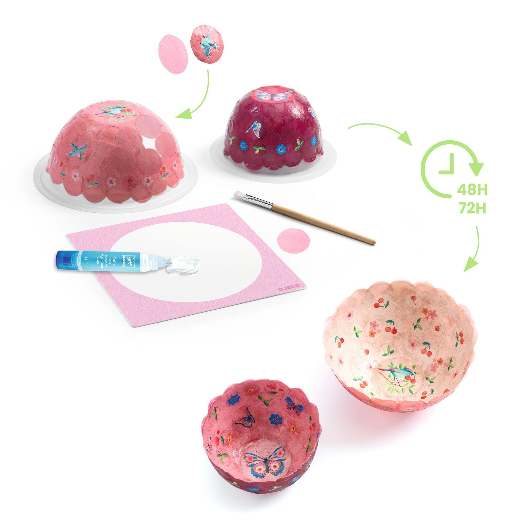 2 coupelles (2 dimensions : ø 9 x 5,5 cm / ø 12 x 6 cm), 2 tubes de colle liquide, 1 palette, 1 pinceau brosse, 4 sachets de grands confettis illustrés en papier, 1 feuillet de pas-à-pas détaillé.