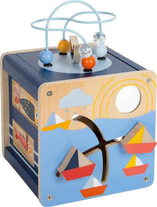 Avec deux circuits de motricité, un jeu à formes, un labyrinthe coulissant et un jeu de volets rotatifs sur cinq surfaces jouables, ce cube de motricité maritime en bois solide est un outil polyvalent pour jouer, apprendre et découvrir ! Le cube de jeu aux couleurs modernes avec une grande partie de bois naturel visible entraîne la perception des formes et des couleurs, stimule l'habileté et la motricité fine, améliore la coordination œil-main et stimule l'imagination. De forts contrastes de couleurs ainsi qu'un miroir stimulent le sens de la vue et la reconnaissance de soi chez l'enfant. Le couvercle amovible peut être rangé dans le cube pour gagner de la place.