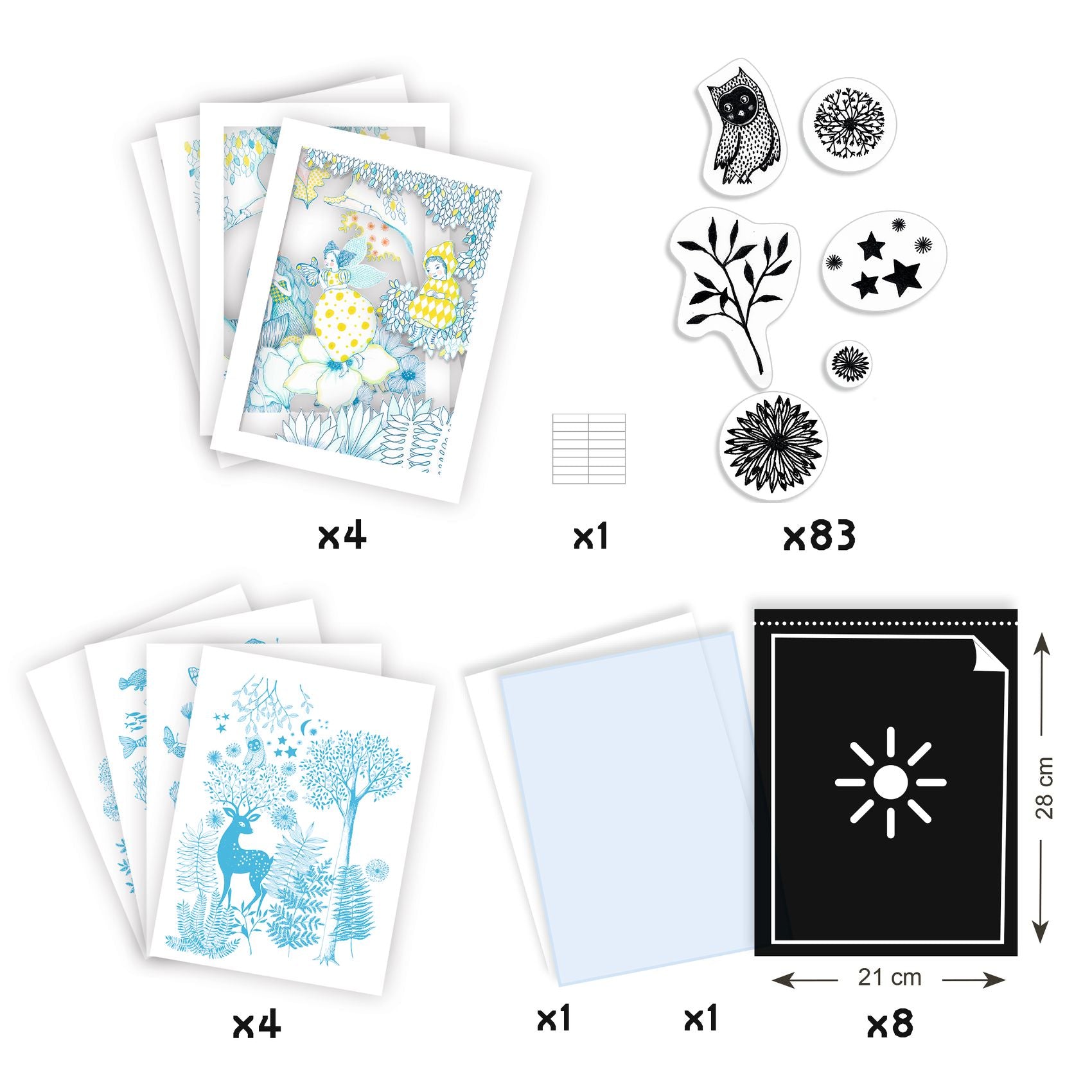 4 cadres avec découpe au laser, 8 feuilles de papier photosensible (21 x 28 cm), 83 motifs imprimés sur rhodoïd, 1 plaque de plexiglas, 1 planche d'adhésifs double-face