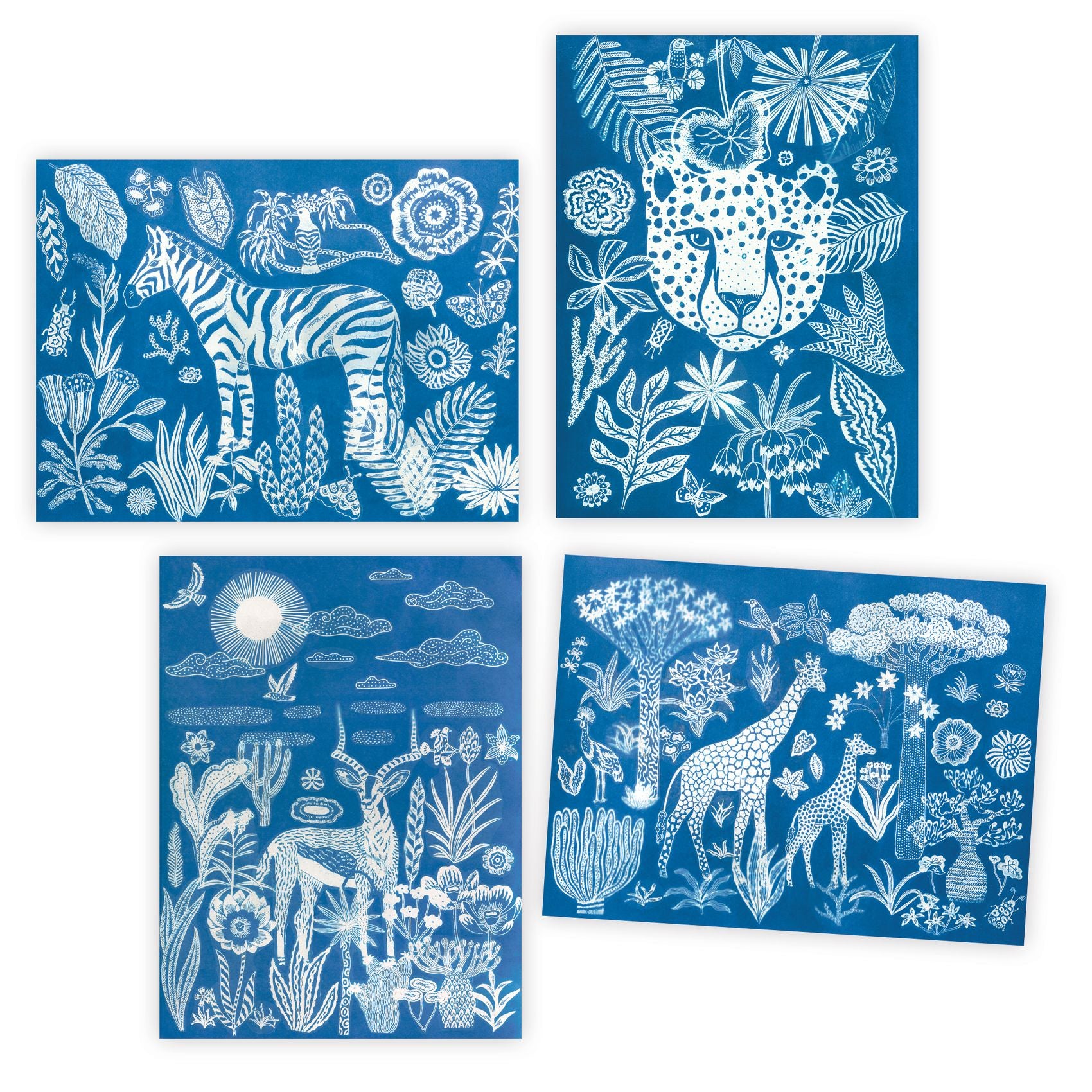 Magique, cette activité s’inspire d’un procédé emprunté à la photographie : le cyanotype. À l’aide de motifs opaques, l’enfant crée des scènes illustrées sur un papier photosensible. Après une exposition au soleil, le papier est marqué des motifs en négatif. Il n’y a plus qu’à rincer le papier dans un bain d’eau claire et les créations se révèlent sur fond bleu ! Des motifs riches et variés pour créer 4 tableaux nocturnes et poétiques.