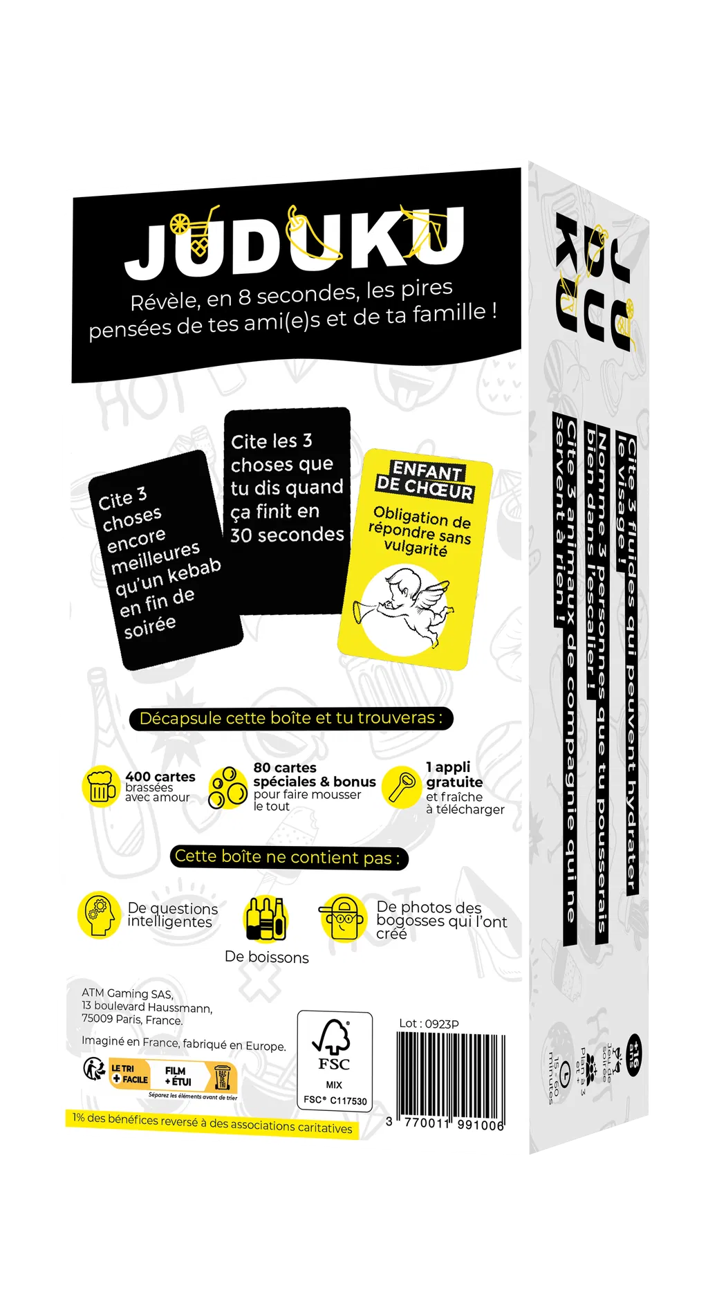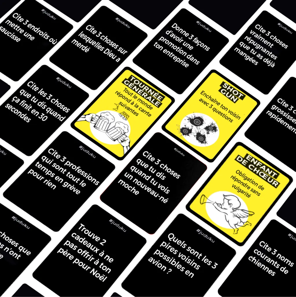Juduku c’est 480 cartes questions pour révéler les pires secrets et les vices cachés de vos amis. Le concept, un joueur est désigné « maître du Juduku » il pose une question à un autre joueur qui a 8 secondes pour y répondre. « Donne trois défauts de ton ex », « Cite trois choses que tu dis quand tu vois un nouveau-né moche » « Cite 3 moments où il faut absolument sentir avant de lécher ». Si les réponses sont acceptées par le Maître du Juduku alors le joueur qui a répondu reçoit un point et devient à son tour le Maître du Juduku.