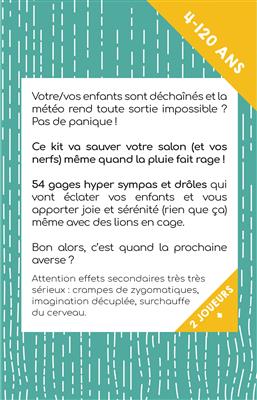 Votre/vos enfant(s) sont déchaînés et la météo rend impossible toute sortie ? Pas de panique ! Ce kit va sauver votre salon (et vos nerfs) même quand il pleut des cordes. Ce kit contient 54 défis ou activités pour occuper les enfants même quand il fait moche et leur faire passer une après-midi joyeuse sans s’ennuyer !