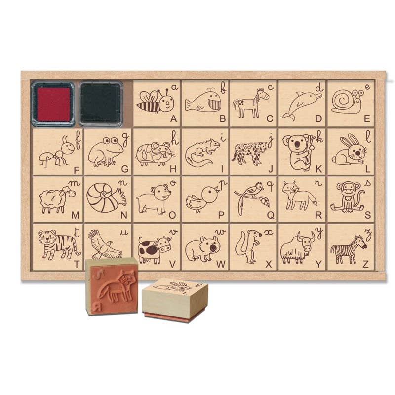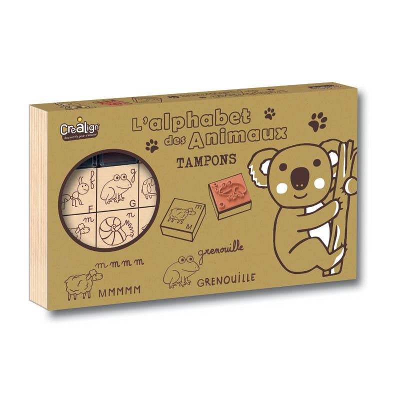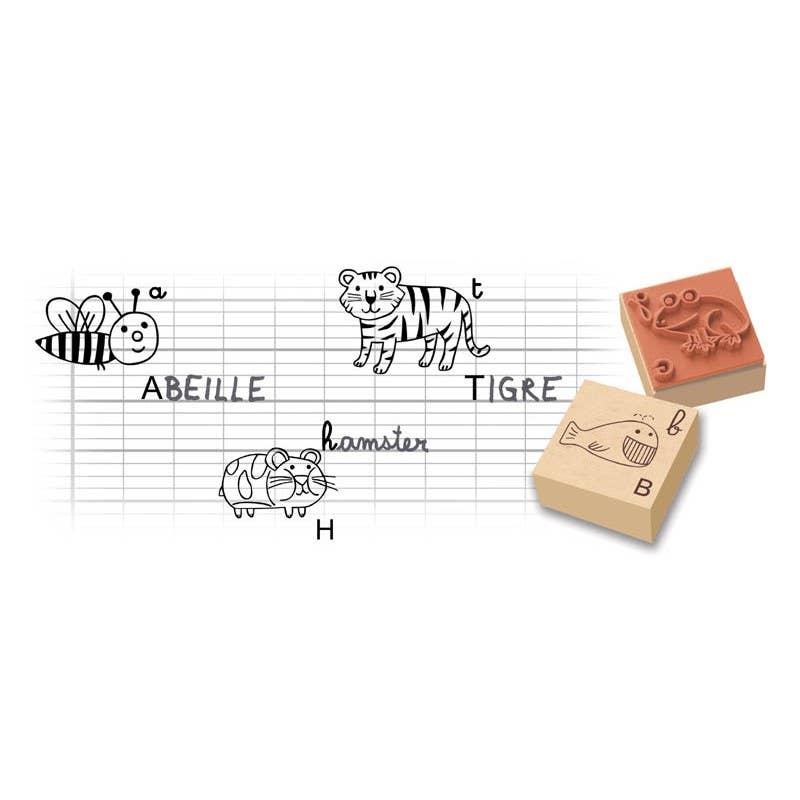 Un grand coffret bois pour tamponner et s'exercer à l'écriture des lettres de l'alphabet en minuscules et majuscules.