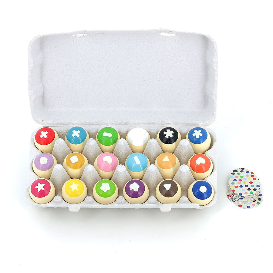 Comme le jeu de mémo classique, il faut reconstituer les paires en retrouvant les signes identiques sous les œufs.