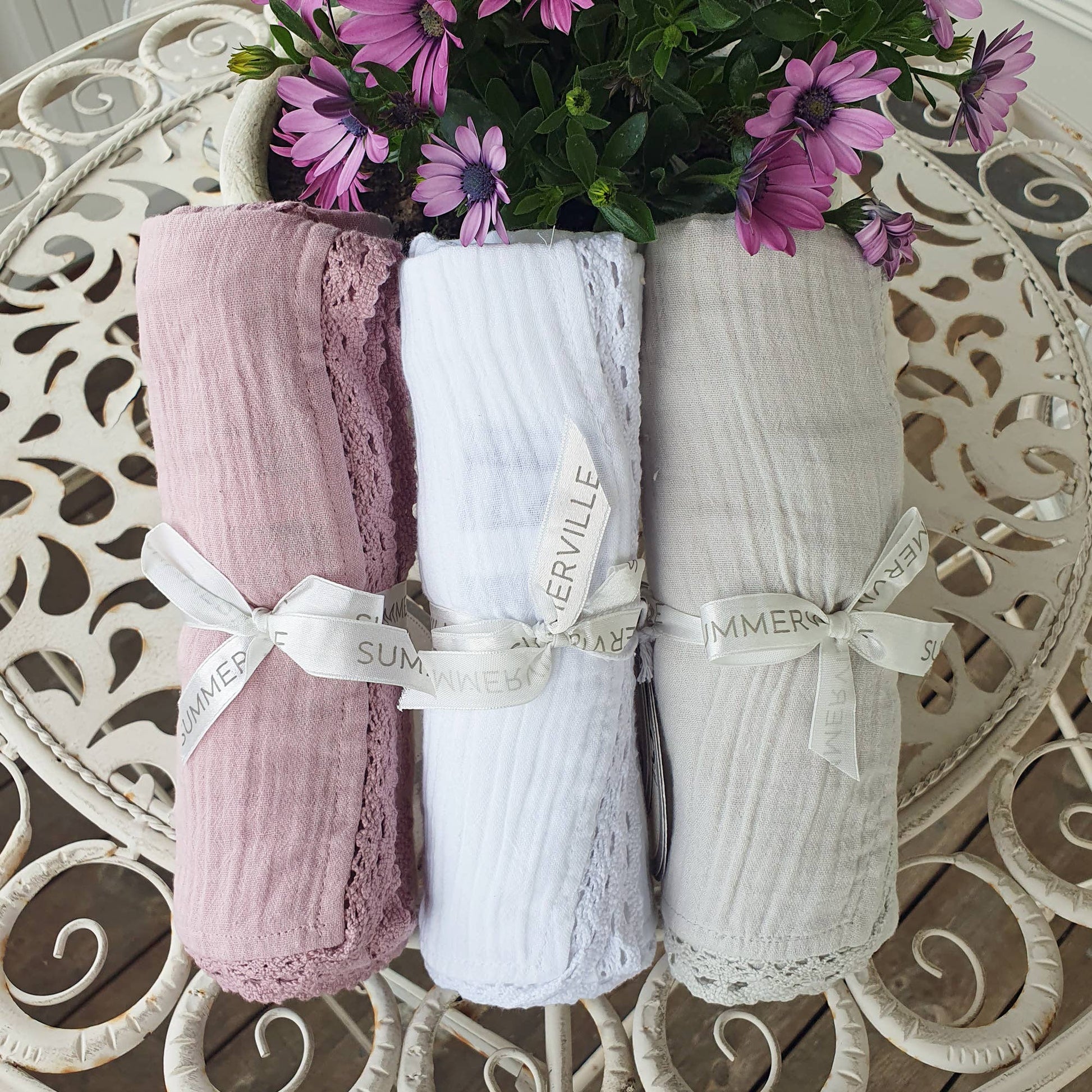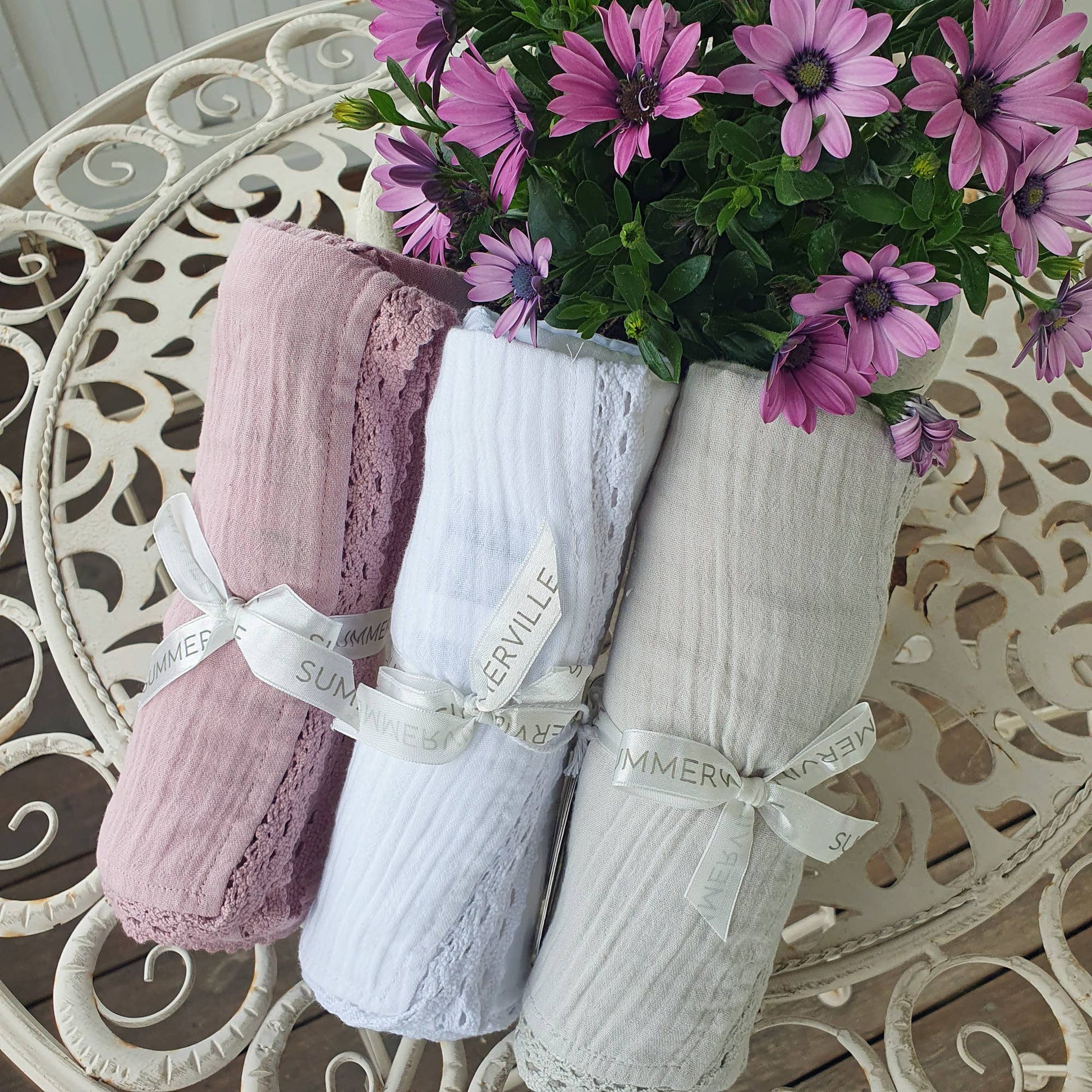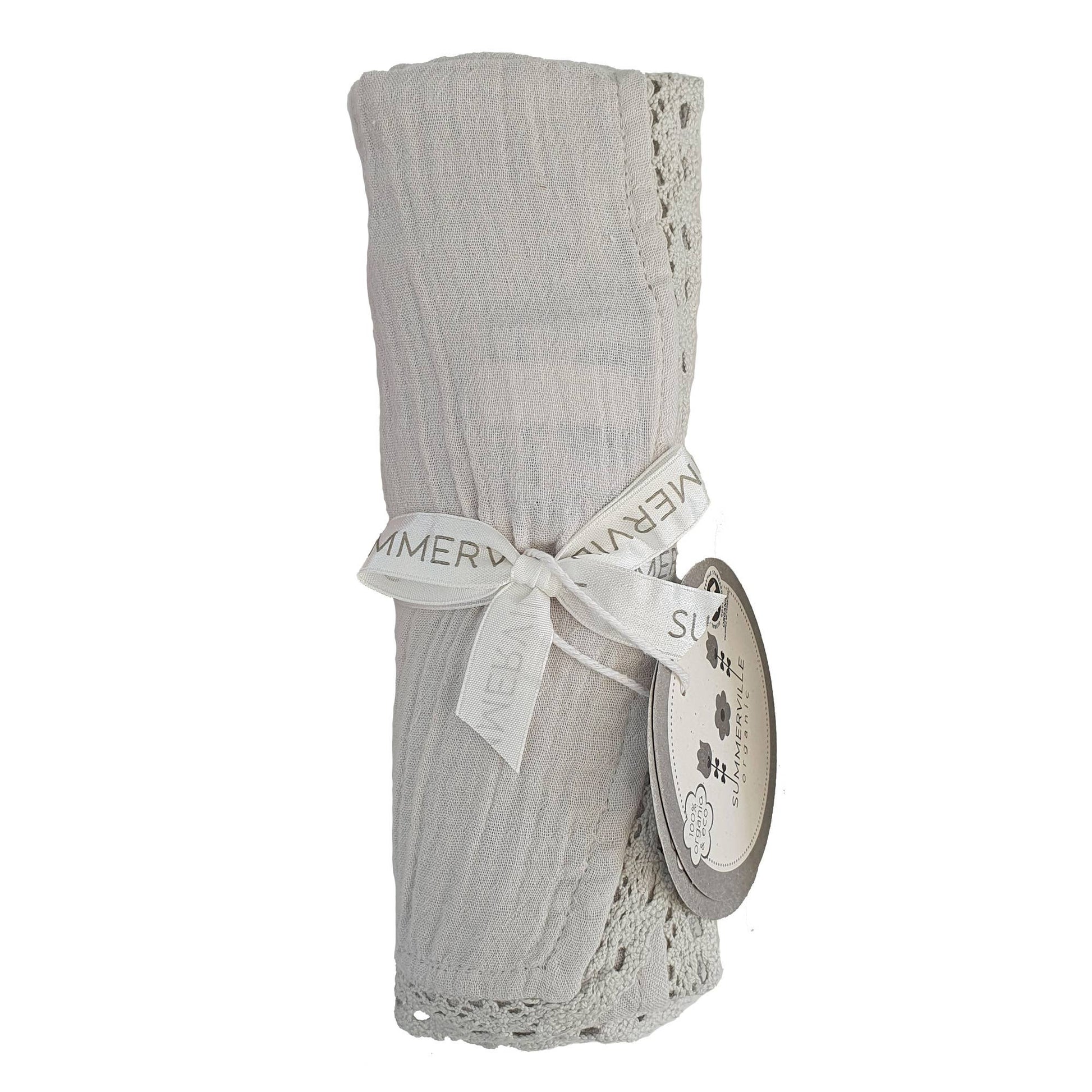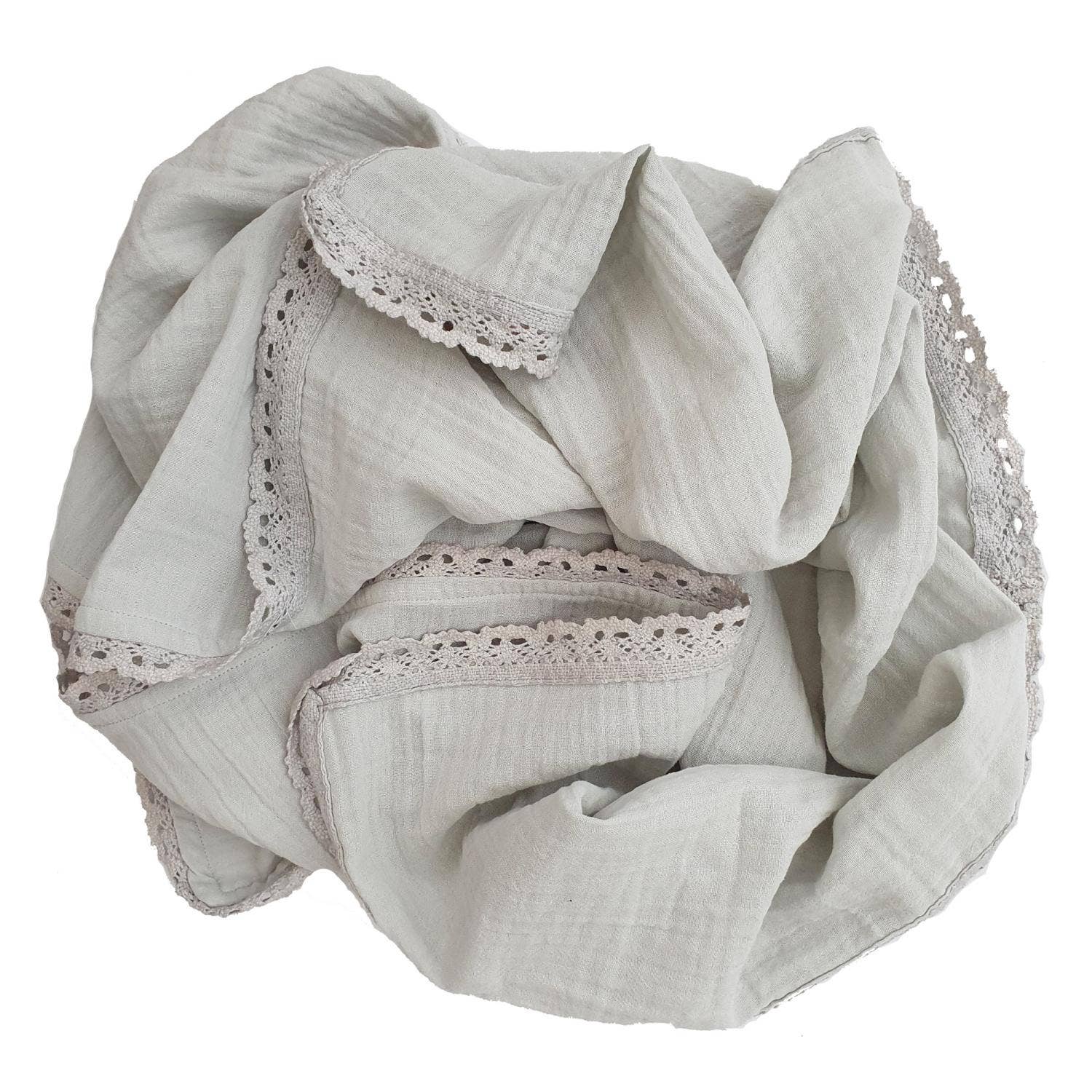 Couverture pour bébé en mousseline de coton biologique froissée douce avec un doux passepoil en dentelle.