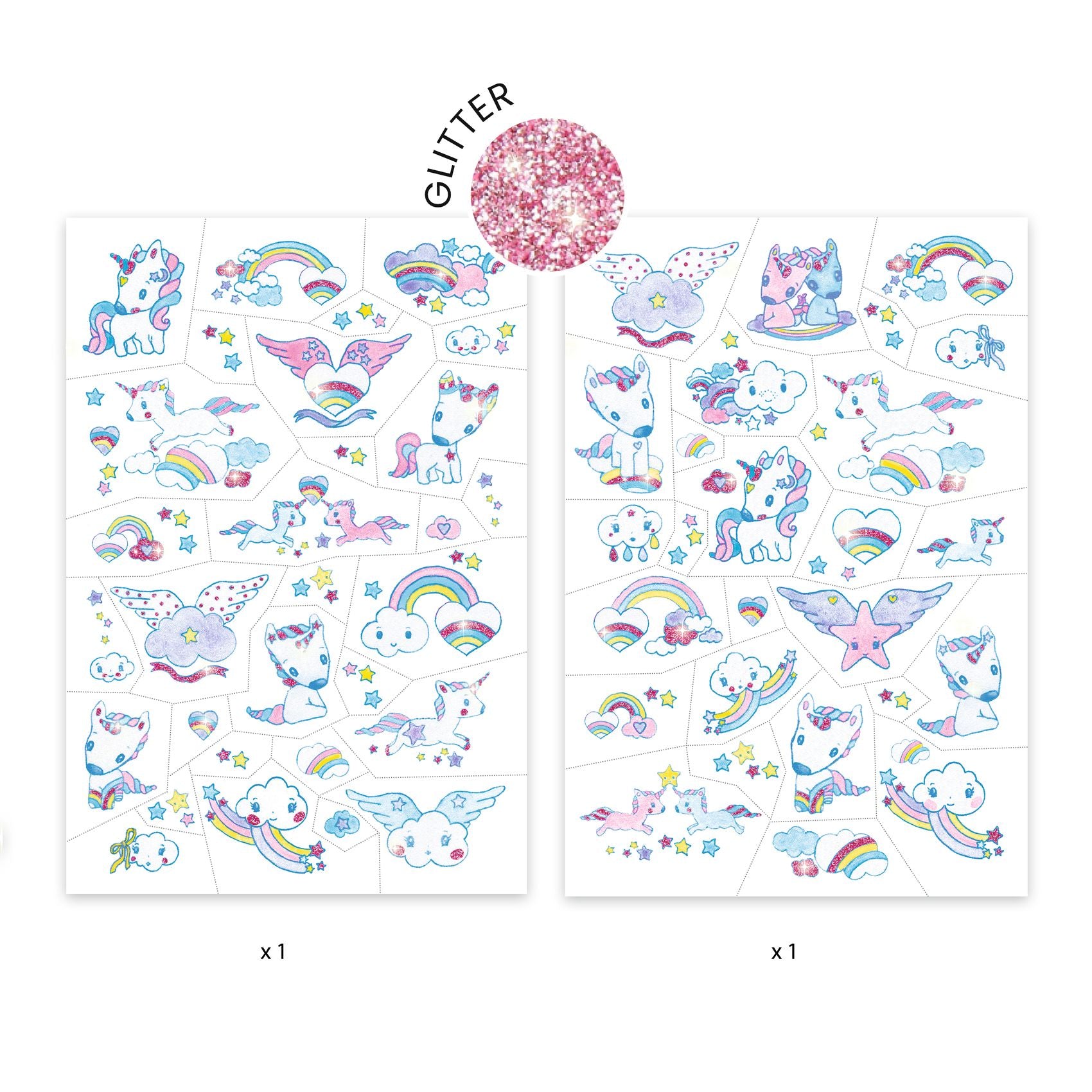 Deux planches de tatouages temporaires sur le thème des licornes. Pour le plus grand plaisir des enfants, ils sont parsemés de paillettes roses ! Faciles à utiliser, ils sont prédécoupés et s'appliquent avec un peu d'eau. Testés dermatologiquement.